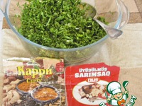 Нарезаем тонко и мелко зелень, у меня были щавель, петрушка, кинза, зеленый лук, добавила соль, карри и чеснок. |