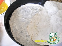 Форму снизу смазать сливочным маслом, накрыть лавашом, мажем маслом, соусом, кладем зелень. |
