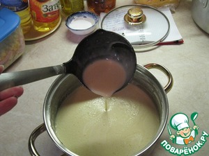 разбиваем 2 яйца и хорошо взбиваем, добавляем соль, сахар, молоко и щепотку соды, тщательно перемешиваем.