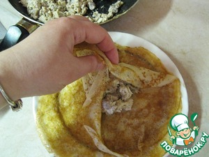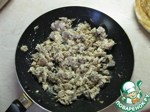 обжариваем мясо ( грудку) с последующем добавлением грибом и белым луком (кто любит). Добавляем пару ложек сметаны и тушим еще минут 5. Снимаем с огня и даем остыть -