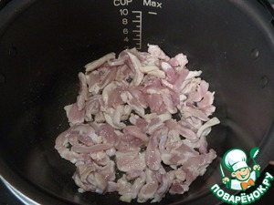 В разогретое масло выложить кусочки куриного филе, нарезанного узкими полосками. Обжаривать курицу до золотистого цвета, затем "жарку" отключить.