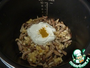 Добавить сметану, порошок карри и кайенский перец. Еще раз хорошо перемешать. Закрыть крышку и потушить минут 20-25.