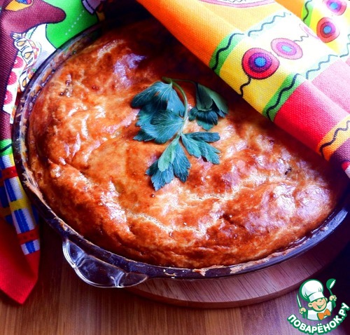 Желток смешать с 1 ст. л. простокваши и смазать поверхность пирога. Дать постоять минут десять и выпекать при 200 градусах до образования аппетитной корочки. Мне понадобилось 40 минут. -