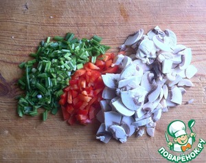 Грибы протереть салфеткой и нарезать пластиками. Мелко нарезать зелёный лук. Перец порезать кубиками.