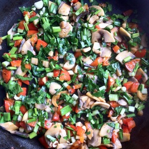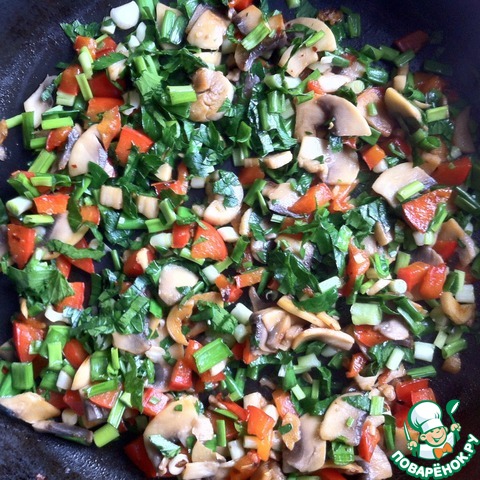 Налить в сковороду 2 ст. л. подсолнечного масла. Обжарить перец примерно 2 минуты. Затем добавить грибы и обжарить вместе ещё 5 минут.