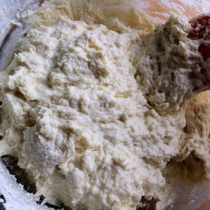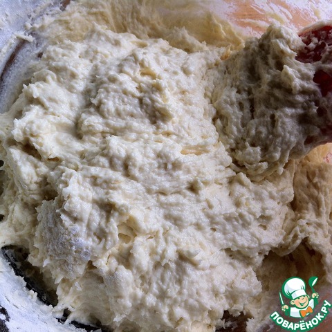 В миске слегка взбить яйцо с 1/2 ч. л. соли и сахаром. Добавить простоквашу, размягчённое сливочное масло, 1 ст. л. подсолнечного масла и муку, просеянную с разрыхлителем. По консистенции тесто должно быть похожим на густую овсяную кашу.