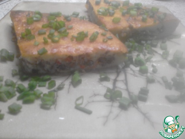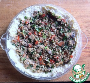 Форму смазать маслом и присыпать мукой. Распределить в ней примерно 2/3 теста. Выложить остывшую начинку.
