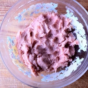 Из трескового фарша делаем лепешки, кладём на них лососевый фарш и формируем шарики. Удобно это делать мокрыми руками.