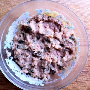 В лососевый фарш добавить оставшийся хлеб, яйцо, укроп, соль и перец.