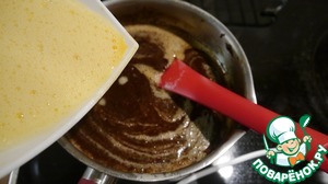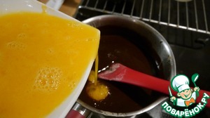 Когда шоко-смесь чуть-чуть остыла, вливаем туда половину яичной смеси, непрерывно помешивая, чтобы яйца не свернулись.