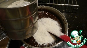 Муку, смешанную с разрыхлителем, аккуратно просеиваем и потихоньку добавляем в шоколадную смесь, непрерывно размешивая.