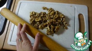Отмеряем грецкие орехи и измельчаем их скалкой на доске. Можно еще слегка порубить ножом