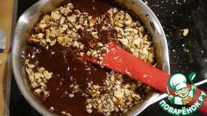 Всыпаем изюм и орехи в шоколадную смесь и перемешиваем.