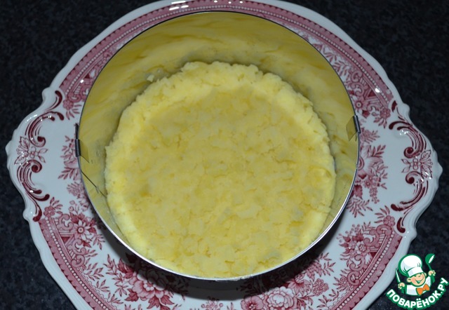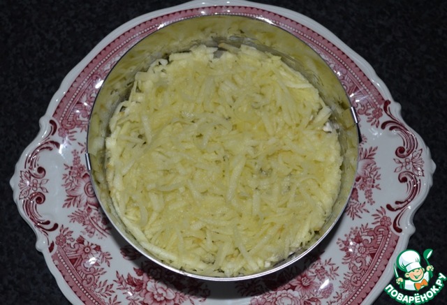 1-й слой: картофель тёртый на крупной тёрке, промазать немного майонезом. -