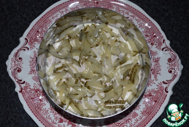 З-й слой: маринованный огурец, порезать мелкой соломкой. Майонез не надо.