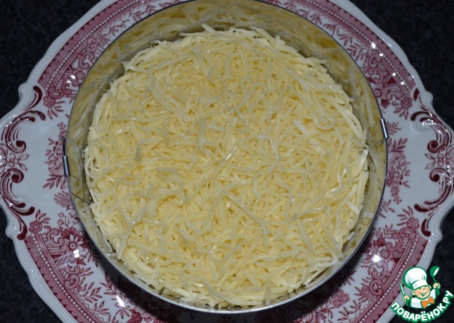 5-й слой: тёртый твёрдый сыр на крупной тёрке. Опять майонез.