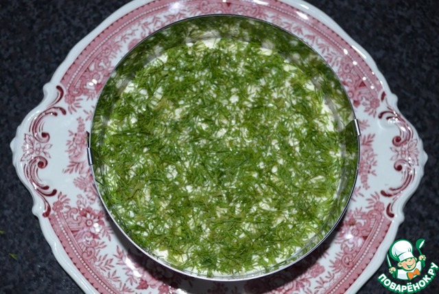 6-й, последний слой: свежий укроп мелко порезанный. Майонез не нужен.