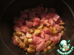 Когда грибы немного подрумянились добавляем растительное масло (рафинированное без запаха), мясо берет в себя масло