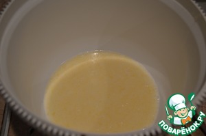Сливочное масло растапливаем и охлаждаем. Слегка взбиваем яйца с молоком и вводим охлажденное масло. Перемешиваем.