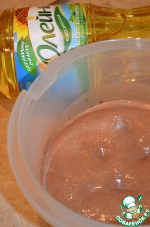 Перед выпечкой блинов достаем тесто из холодильника и добавляем в него столовую ложку растительного масла Олейна, хорошо перемешиваем. За ночь тесто станет слегка гуще.
