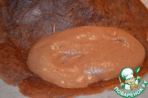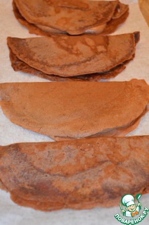 Противень застилаем бумагой для выпечки и выкладываем на него блины. На одну половину блина выкладываем по 2 ст. л. шоколадного суфле и накрываем второй половиной, НЕ ПРИДАВЛИВАЯ.