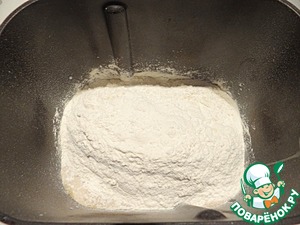 Сначала замешиваю тесто с помощью хлебопечки (можно замесить тесто и обычным способом). В ведерко хлебопечки наливаю теплое молоко, добавляю сухие дрожжи, соль, сахар, размягченное сливочное масло, яйцо, просеянную муку.