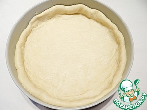 Разъемную круглую форму диаметром 25 см смазываю растительным маслом, помещаю в нее круг из теста, формуя дно и бортики. Накрываю форму пленкой и даю тесту увеличиться в объеме в 1,5-2 раза.