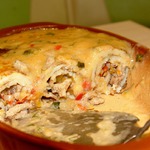 8. Духовку разогреть до 175 градусов. Залить блины получившимся соусом и запекать в духовке 15 минут. Подавать вместе с оставшимся в форме соусом.