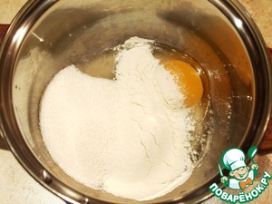 Для начала приготовим соус. Для этого в кастрюльке соединить яйцо, сахар и муку. Перемешать до однородности.