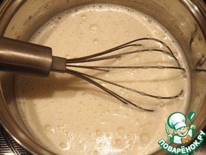 Влить теплое молоко, поставить на огонь. Варить до загустения, постоянно (!!!) помешивая венчиком. Примерно 5-7 минут. Снять с огня и поставить остужаться.