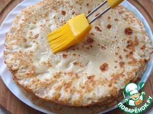 Испечь блинчики на сковороде, при необходимости смазывая ее подсолнечным маслом "Олейна". Готовые блинчики смазать растопленным сливочным маслом. У меня получилось 10 блинчиков.