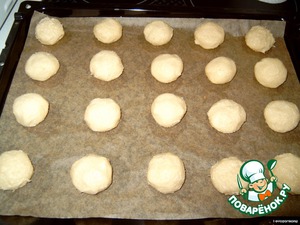Из теста сформировать небольшие шарики, выложить их на противень.