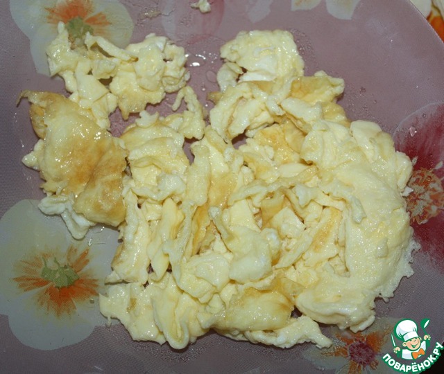 В процессе жарки перемешивать, чтобы получились отдельные кусочки. Извлечь яйца из сковороды
