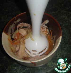 Займёмся начинкой. Курицу отварить, предварительно сняв кожицу (бульон использую в соус, мясо-в начинку)