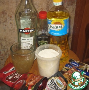 В сковороде закипятить бульон, добавить туда кетчуп, специи, соевый соус и "Мартини", перемешать