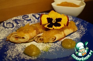 Блинчики сверните трубочкой, посыпьте сахарной пудрой и полейте ананасово- имбирным соусом.