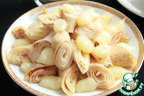 Как только соус начал густеть снимаем его с огня. Белок не сваривается, не распадается на крупинки соус получается однородный, нежный по структуре. Прекрасно подойдет для прослойки тортиков. Поливаем нашим соусом блинчики. Если хотите подать их как у меня, то каждый блинчик сворачиваем и разрезаем наискосок на несколько частей. Выкладываем в виде цветка, поливаем соусом.