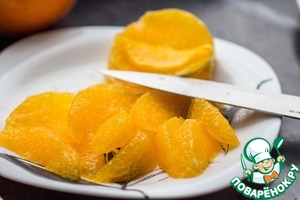 У апельсинов срежем "попки", а затем срежем кожуру, так чтобы осталась только мякоть апельсина без кожицы и белых прожилок.