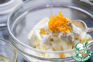 В миске смешаем 1 ст. л. апельсинового сиропа, сливки, сахарную пудру, цедру.