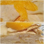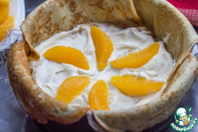 В форму выложим пищевую пленку, на неё 4 блинчика внахлест, так чтобы края свисали. Затем уложим слой взбитых сливок и утопим 5-6 очищенных долек апельсина.
