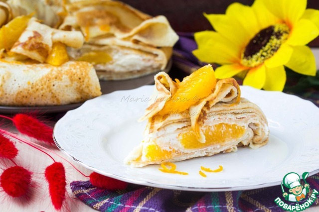 Готовый торт аккуратно перевернем и украсим оставшимися блинчиками, цедрой и дольками апельсина.