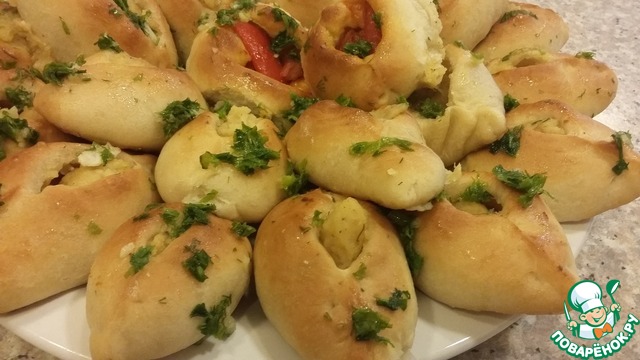 Раскатываем их скалкой (я просто формирую лепешку руками) и лепим пирожки. На один пирожок нужно приблизительно 1 ст. л. начинки.