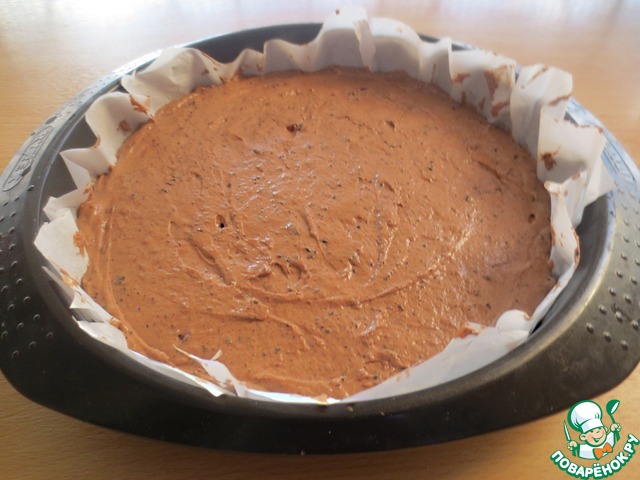Круглую формы застилаем бумагой для выпечки, смазываем ее маслом и выкладываем тесто.