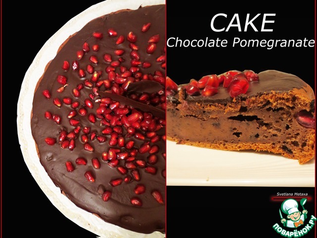 Этот простой в приготовлении пирог, имеет необычный вкус, не только потому что в нем сочетается вкус шоколада и граната, но и потому, что низ и верх пирога более плотный, а в середине текстура напоминает халву.
