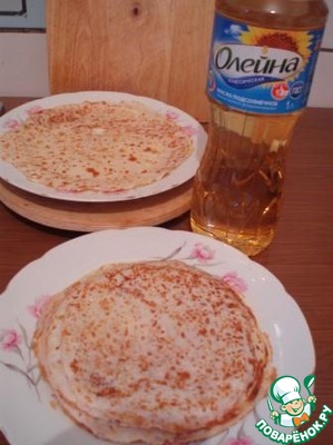 • Испечь блинчики. Я выпекала на двух сковородках – большой и маленькой. Из данного количества теста у меня получилось 7 блинчиков диаметром 15 см. и 2 блинчика диаметром 20 см.