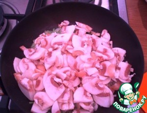 • Добавить нарезанные грибы, все перемешать и обжаривать 1-2 минуты, пока появившийся сок немного не упарится.
