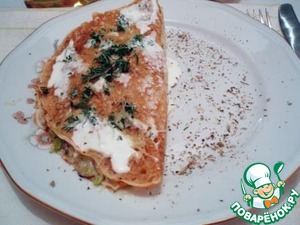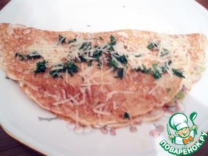 • И аккуратно выложила готовый блинчик на тарелку. Посыпала его нарезанной зеленью и сыром. Тоже самое проделала со вторым блинчиком и выложила его поверх первого.