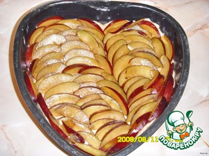 Как я уже сказала, теста мало, потому взяла маленькую форму. Раскатать тесто по форме, выложить на смазанную жиром форму и дать постоять минут 10 в теплом месте. За это время нарезаете сливы на дольки. Разложить красиво на тесте и дать постоять еще 15 минут.