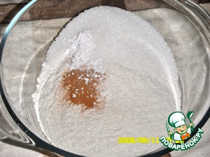 В чашку кладем муку, сахарный песок, ванильный сахар, корицу