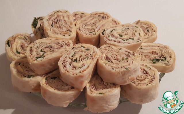 Второй лист лаваша так же смазать майонезом, равномерно распределить по листу сайру и посыпать еще частью зелени. В начало лаваша положить рулет с яйцами и продолжить сворачивание.